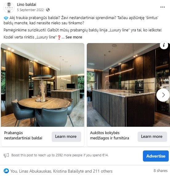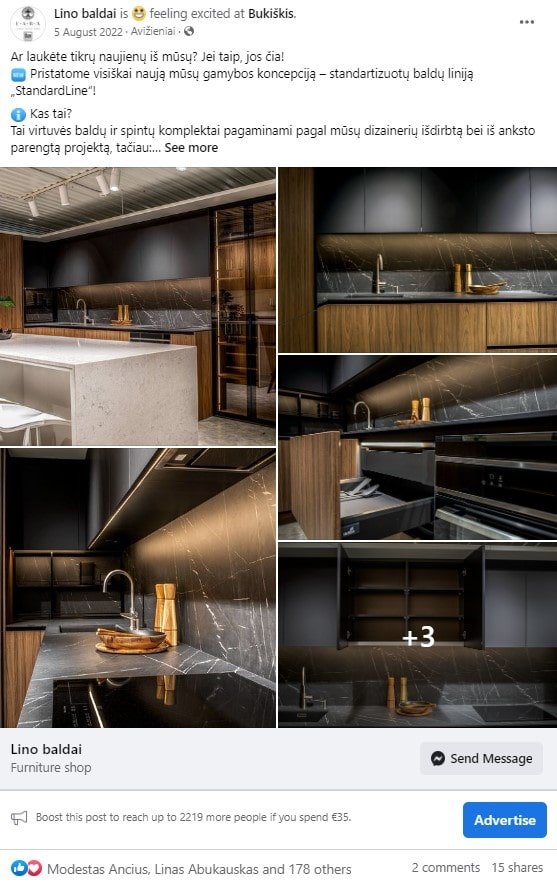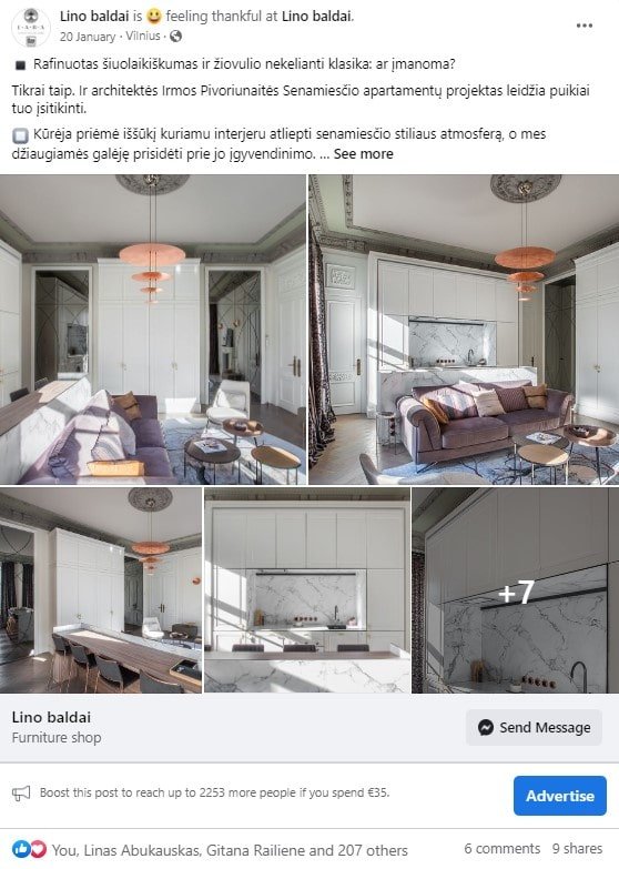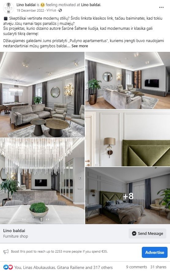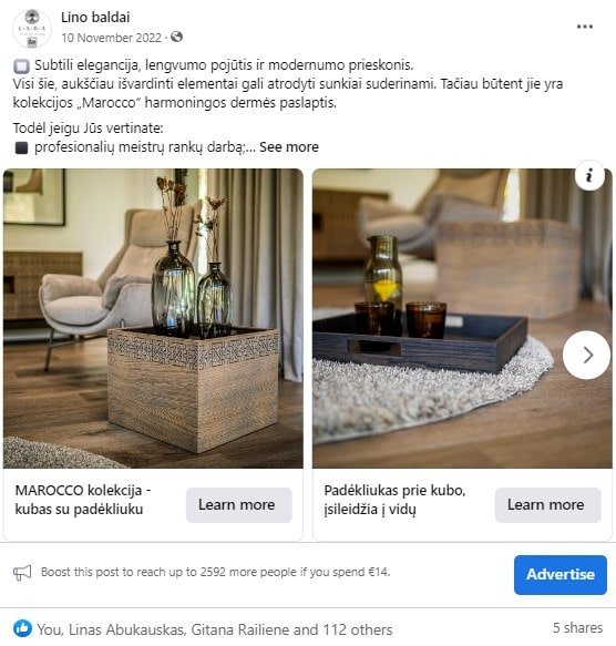 atlikta fotosesija realioje aplinkoje, sukurtas tekstas edukuojantis apie baldų išskirtinumus, panaudojimo galimybes, sukurta reklaminė kompanija tikslinei auditorijai.