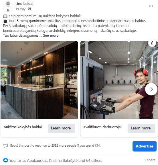 sukurta Facebook karuselės reklaminė kompanija, kurioje atskirai parodomi gamybos etapai.