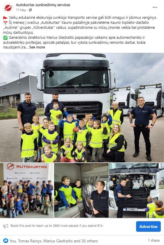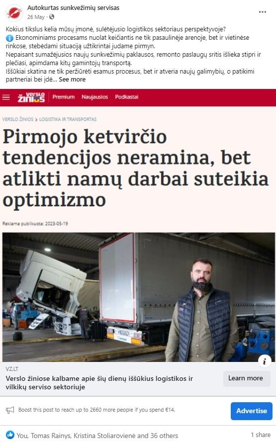 pasidalinti Verslo žinių straipsniu su Facebook auditorija, siekiant parodyti ekspertiškumą ir naujausias žinias apie rinkos tendencijas.