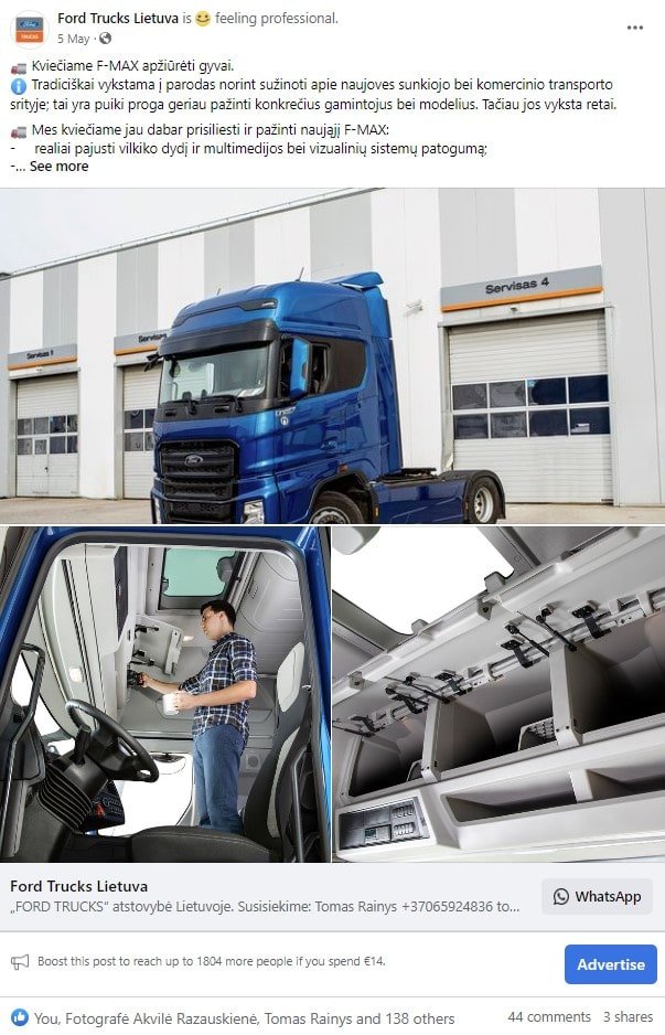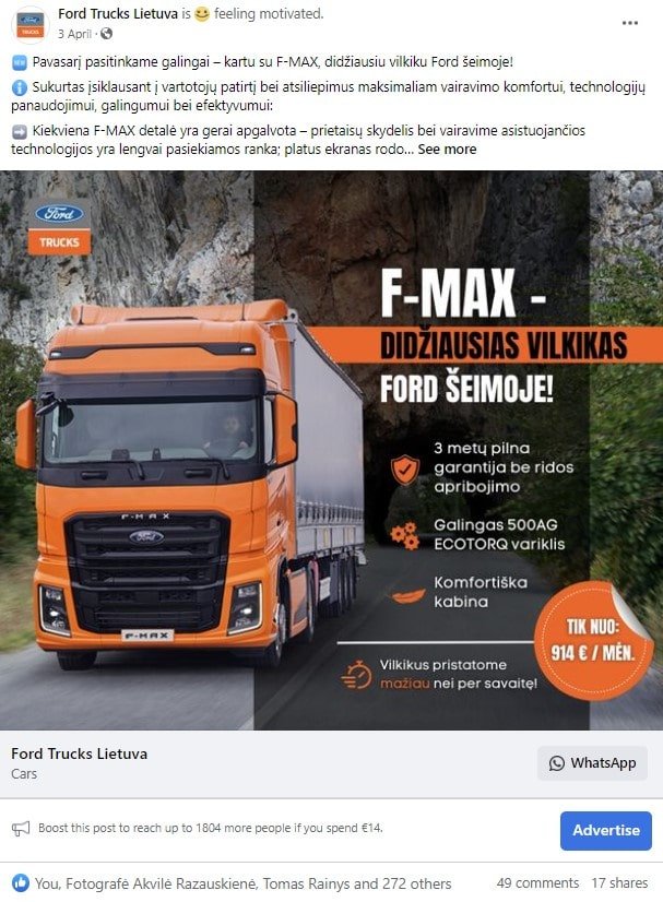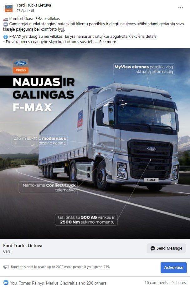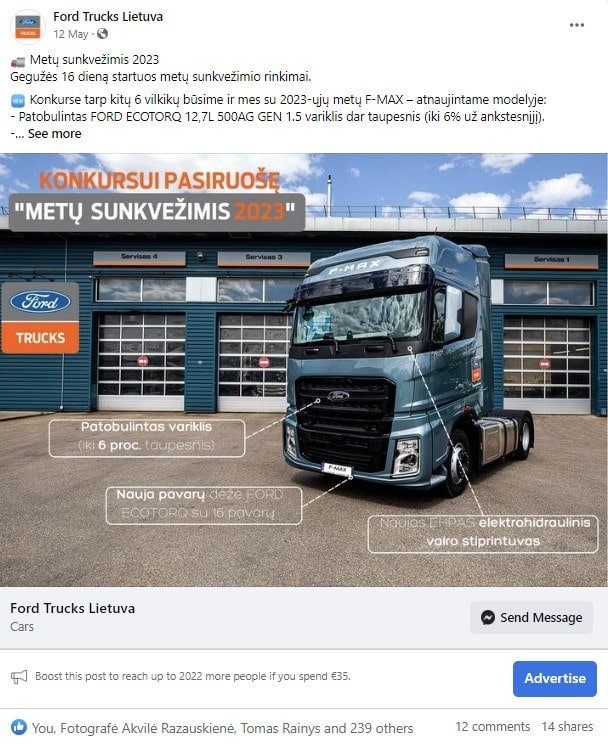buvo sukurtas reklaminis vizualas, sukurtas tekstas atskleidžianti vilkiko išskirtines technines savybes, sukurta reklaminė kompanija tikslinei auditorijai.