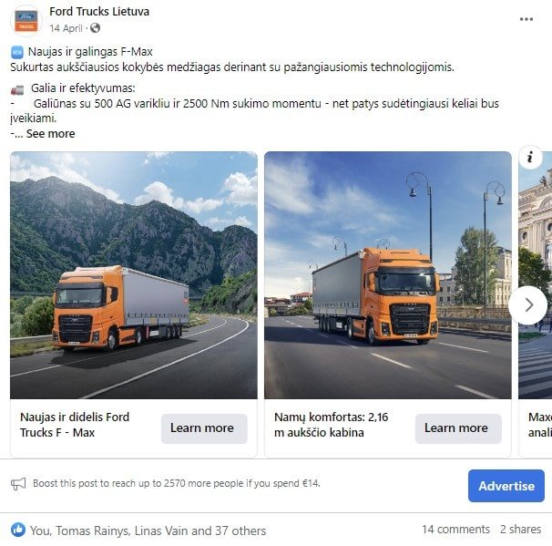 sukurta Facebook karuselės reklaminė kompanija, kurioje pabrėžiami vilkiko požymiai.