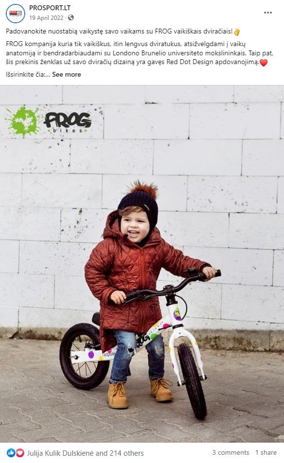 pristatyti artėjantį dviračių sezoną ir vaikams skirtus Frog balansinius dviratukus, paskatinti įsigyti.