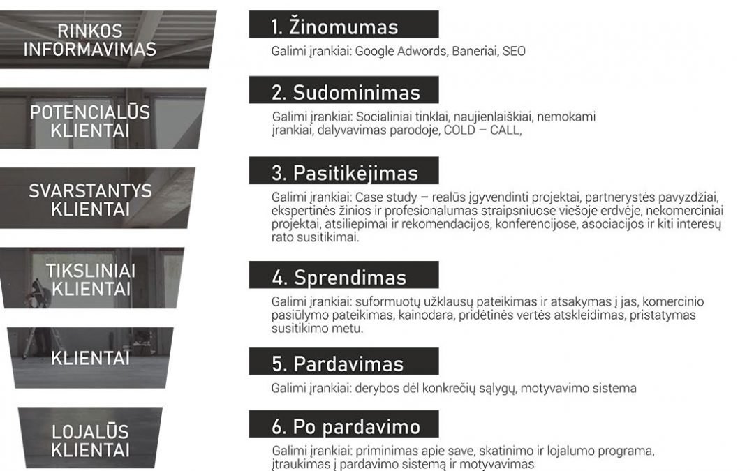 Klientas, prieš atlikdamas pirkimo veiksmą, pereina skirtingus kliento kelionės (angl. – customer journey) etapus. Kiekvieną potencialaus kliento žingsnį pardavimų kanalo specialistai yra suskirstę į atskirus etapus, kad suprastų ir žinotų, kokioje susipažinimo su produktu stadijoje klientas tuo metu yra bei kokios aktyvacijos yra reikalingos. Tam, kad geriau suprastume veiksmų seką, pažvelkime, ką klientas patiria, prieš pirkdamas jūsų produktą ar paslaugą.